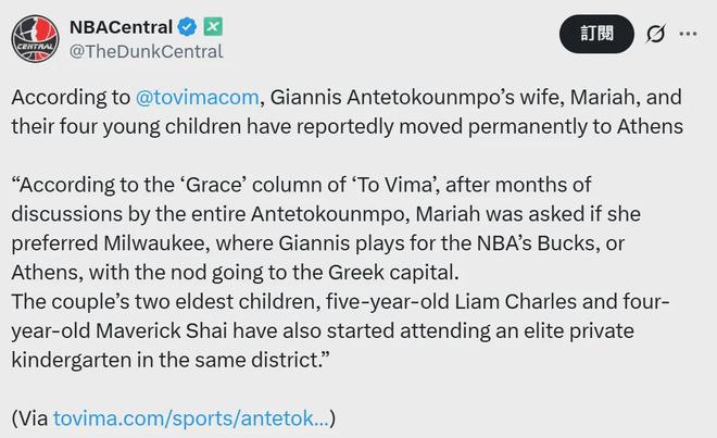 据希腊主流纸媒《To Vima》报道,经过字母哥一家数月的讨论后,字母哥的妻子玛利亚选择带着4个孩子搬离密尔沃基,回到希腊首都雅典居住,字母哥的两个大儿子——五岁的Liam-Charles和四岁的Maverick-Shai——都已经在雅典的一所精英私立幼儿园上学了。
