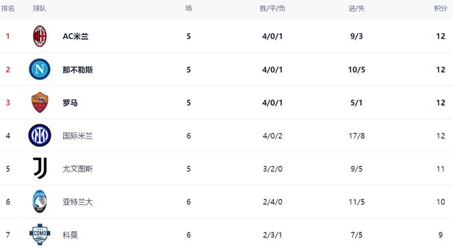 在积分榜上,榜首易主,国际米兰以12分登上了榜首位置。还有3支球队也是12分,但净胜球不如国际米兰。AC米兰、那不勒斯和罗马排名第2到第4,这些球队都比国际米兰少踢1轮。尤文图斯以11分排名第5。亚特兰大只拿到10个积分,排名第6。科莫、萨索洛和克雷莫内塞都是9个积分。而拉齐奥只拿到7分,排名第10。